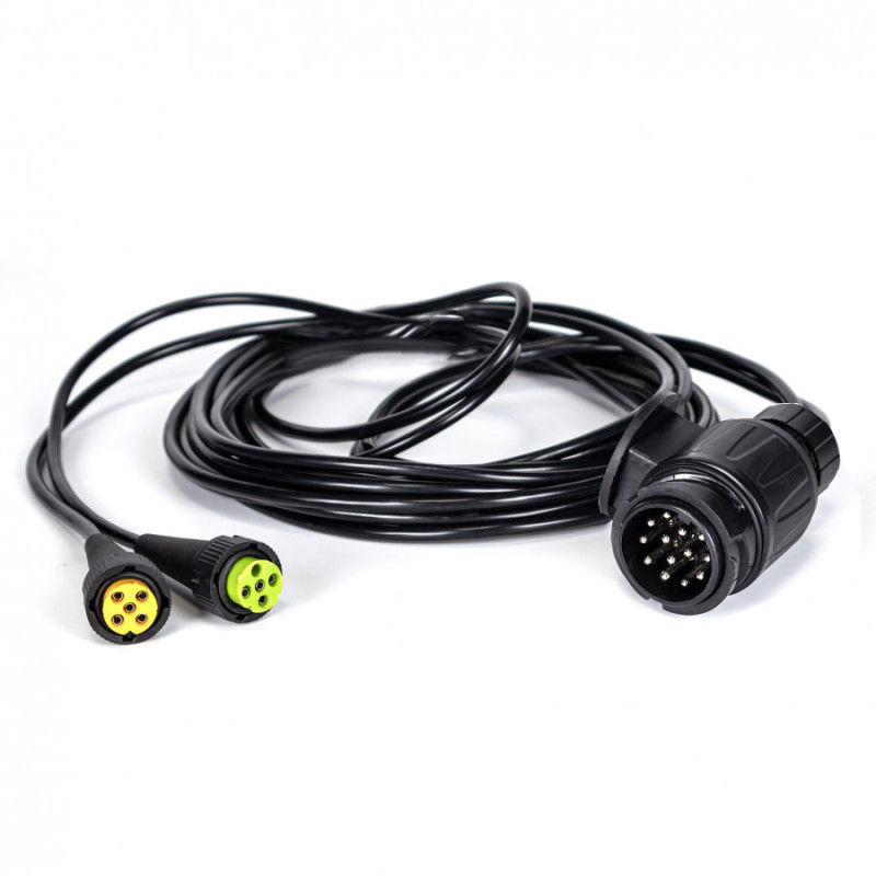 Cable completo de alta calidad diseñado para la conexión de pilotos traseros con clavijas tipo bajonet de 5 pines. Incluye una piña estándar de 13 pines para remolques, caravanas o vehículos agrícolas, garantizando una conexión segura y duradera.