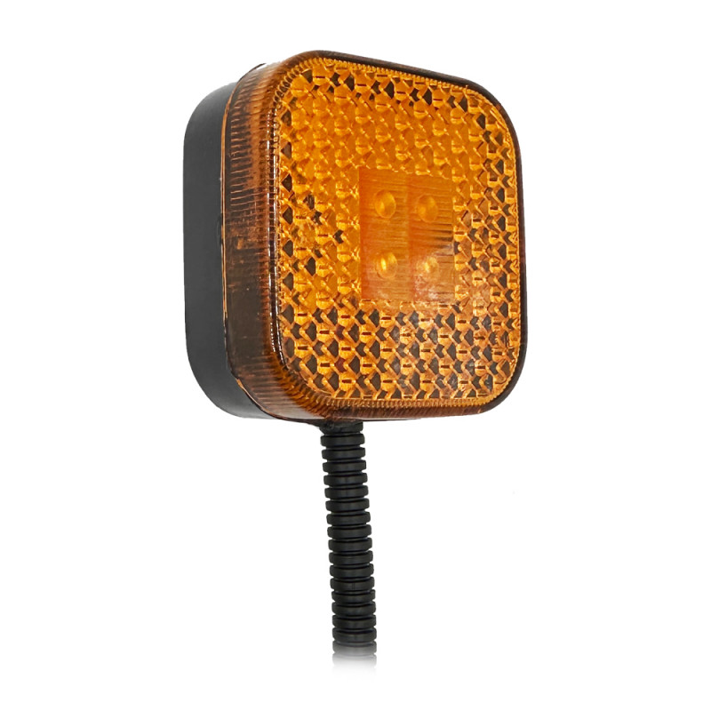 El galibo lateral ámbar LED catadióptrico ofrece alta visibilidad y seguridad para vehículos industriales. Su diseño cuadrado, con lente reflectante y 4 LEDs de alto rendimiento, garantiza una iluminación clara y un óptimo desempeño en cualquier condición.
