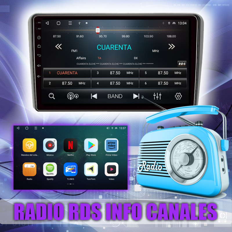 Radio FM con RDS, muestra nombres de emisoras y datos adicionales.