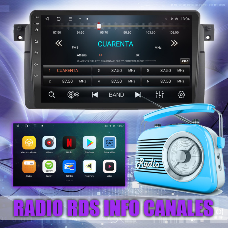 Radio FM con RDS, muestra nombres de emisoras y datos adicionales.
