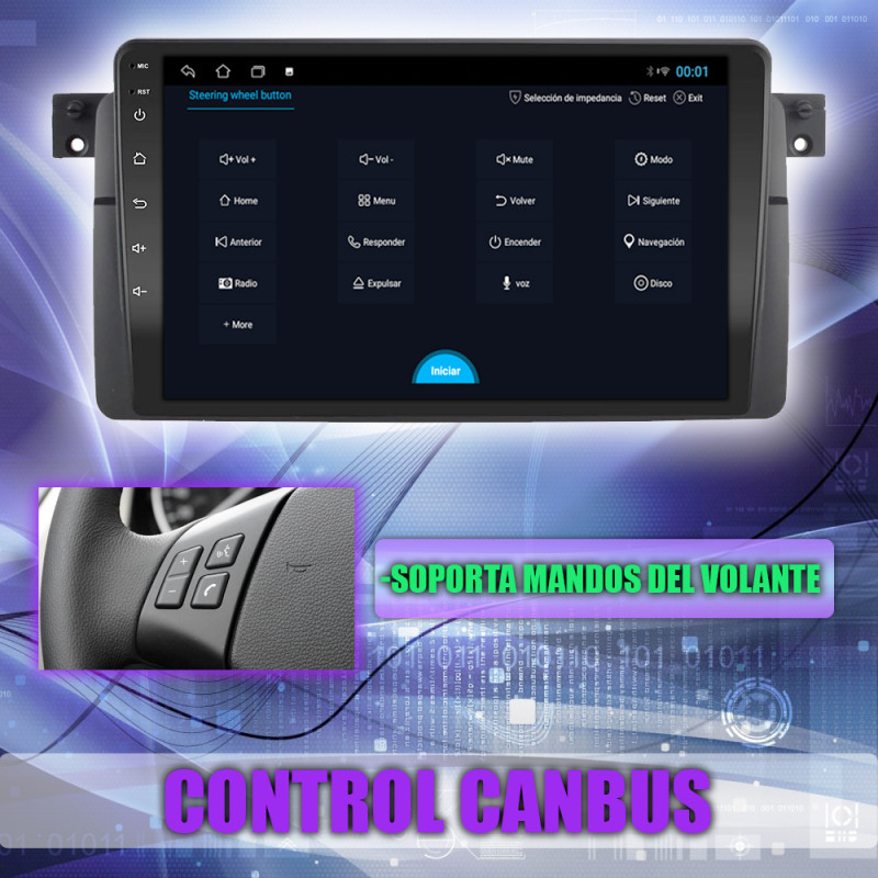 Soporta comunicación CANBUS, permitiendo controlar desde la pantalla los mandos del volante del E46 1999-2005.