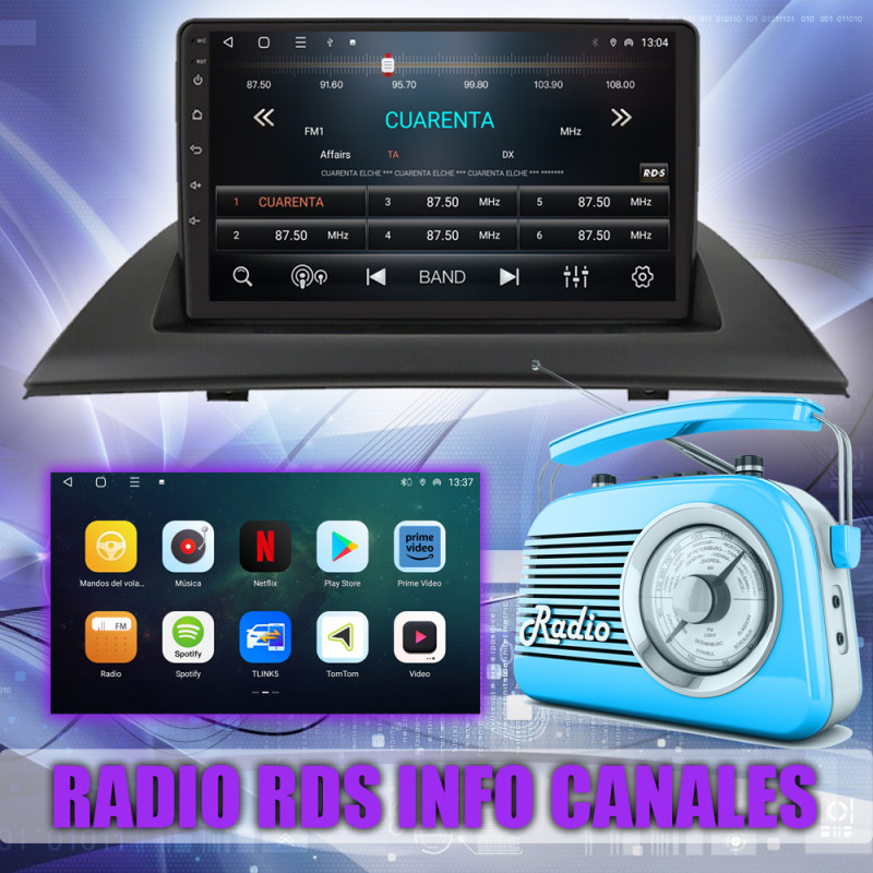Radio FM con RDS, muestra nombres de emisoras y datos adicionales.