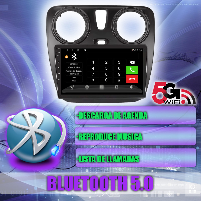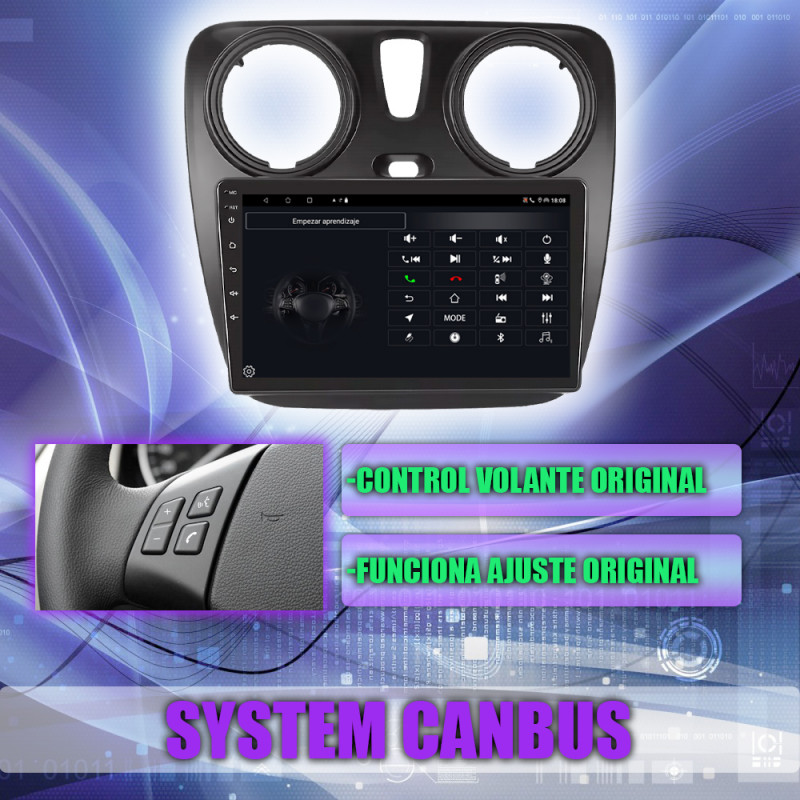 Soporta comunicación CANBUS, permitiendo controlar desde la pantalla los mandos del volante, sensores del coche y ajustes específicos del Renault Dokker Dacia Lodgy.