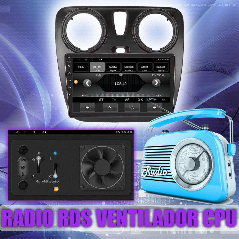 Radio FM con RDS, muestra nombres de emisoras y datos adicionales.