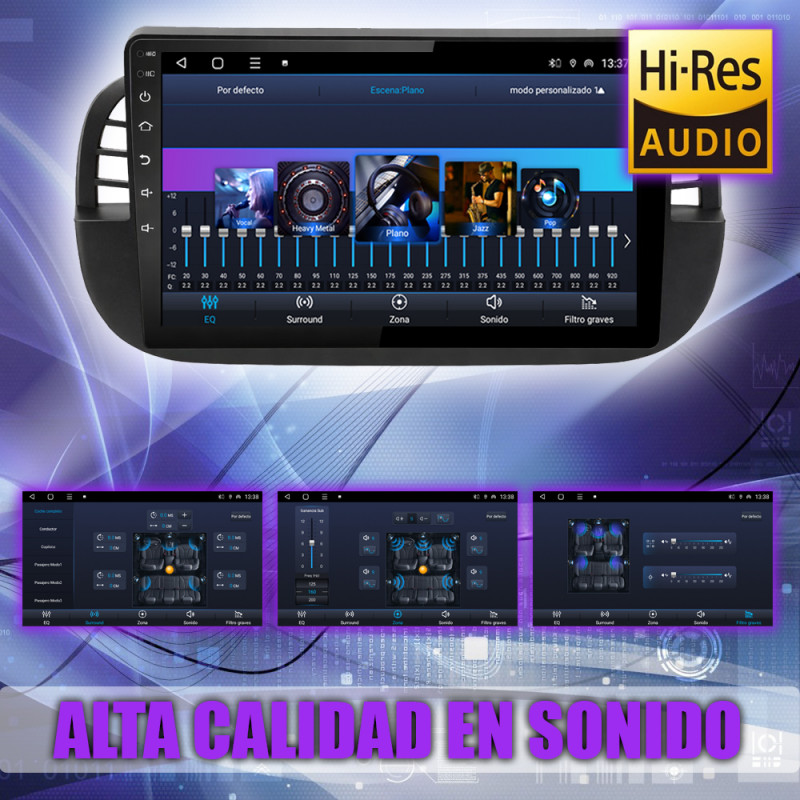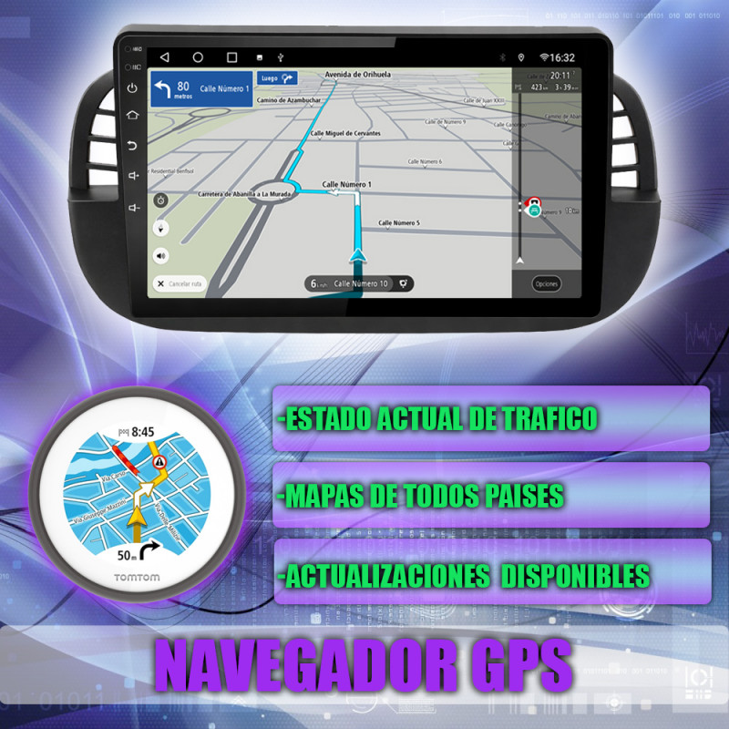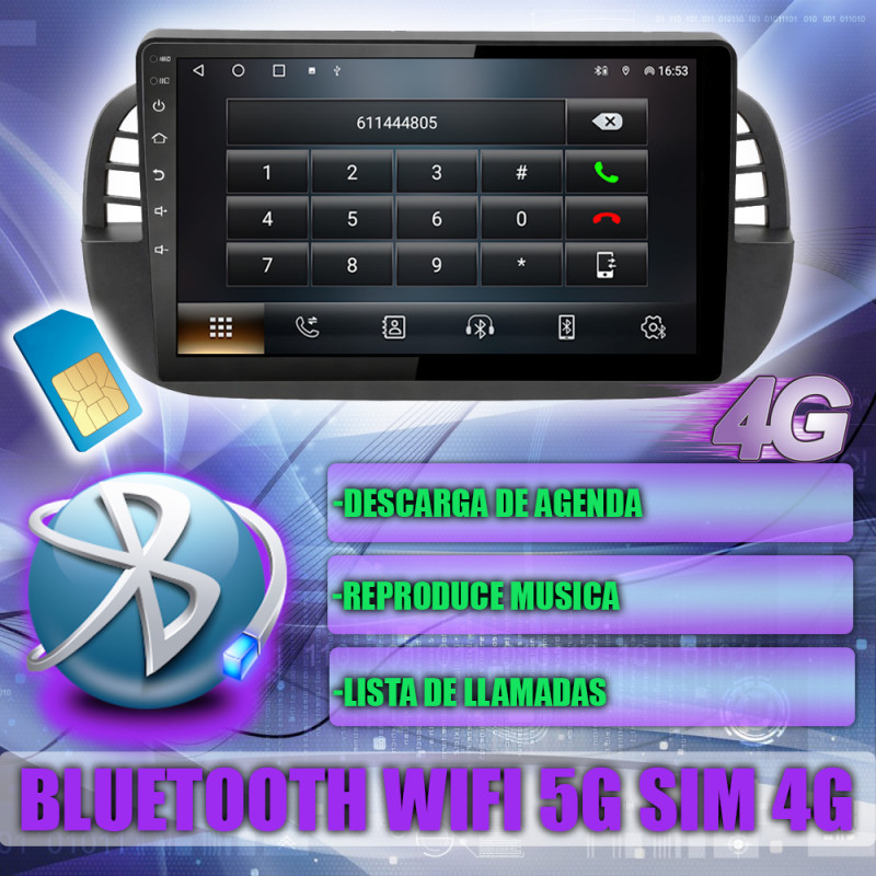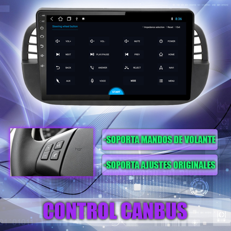 Soporta comunicación CANBUS, permitiendo controlar desde la pantalla los mandos del volante, sensores del coche y ajustes específicos del Fiat 500.