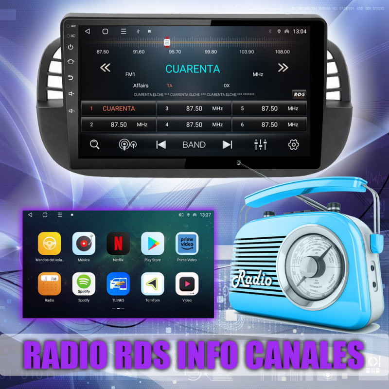 Radio FM con RDS, muestra nombres de emisoras y datos adicionales.