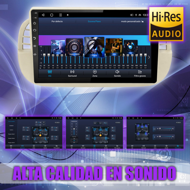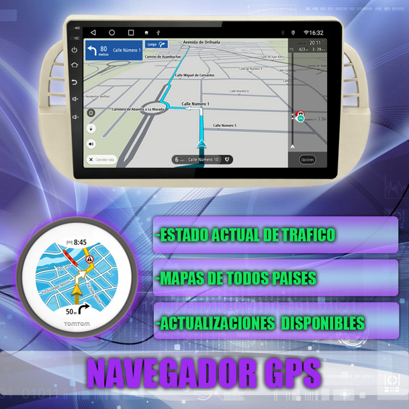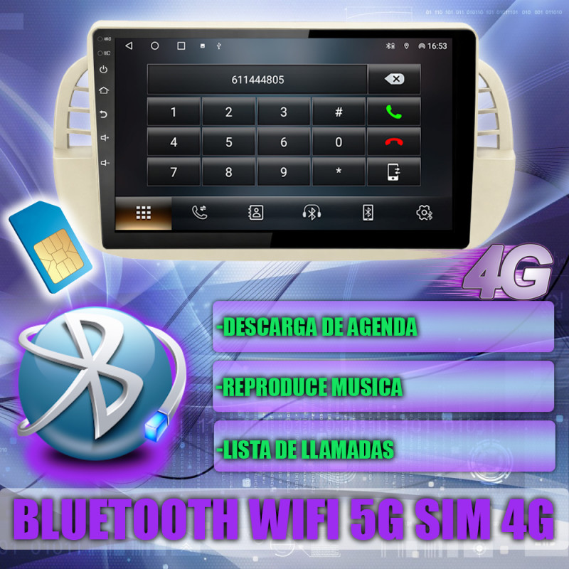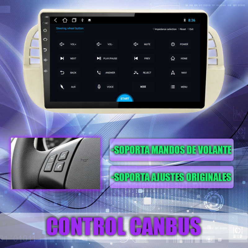 Soporta comunicación CANBUS, permitiendo controlar desde la pantalla los mandos del volante, sensores del coche y ajustes específicos del Fiat 500.