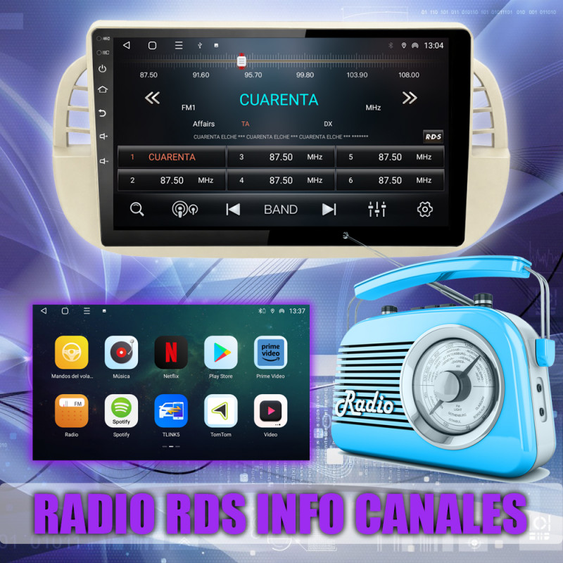 Radio FM con RDS, muestra nombres de emisoras y datos adicionales.