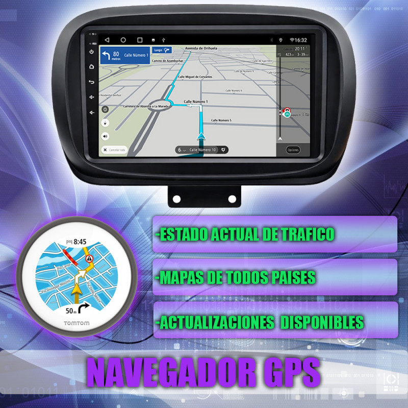 Memoria 2 GB de RAM y 32 GB de almacenamiento interno (ROM) para aplicaciones, mapas y contenido multimedia.