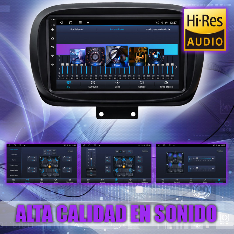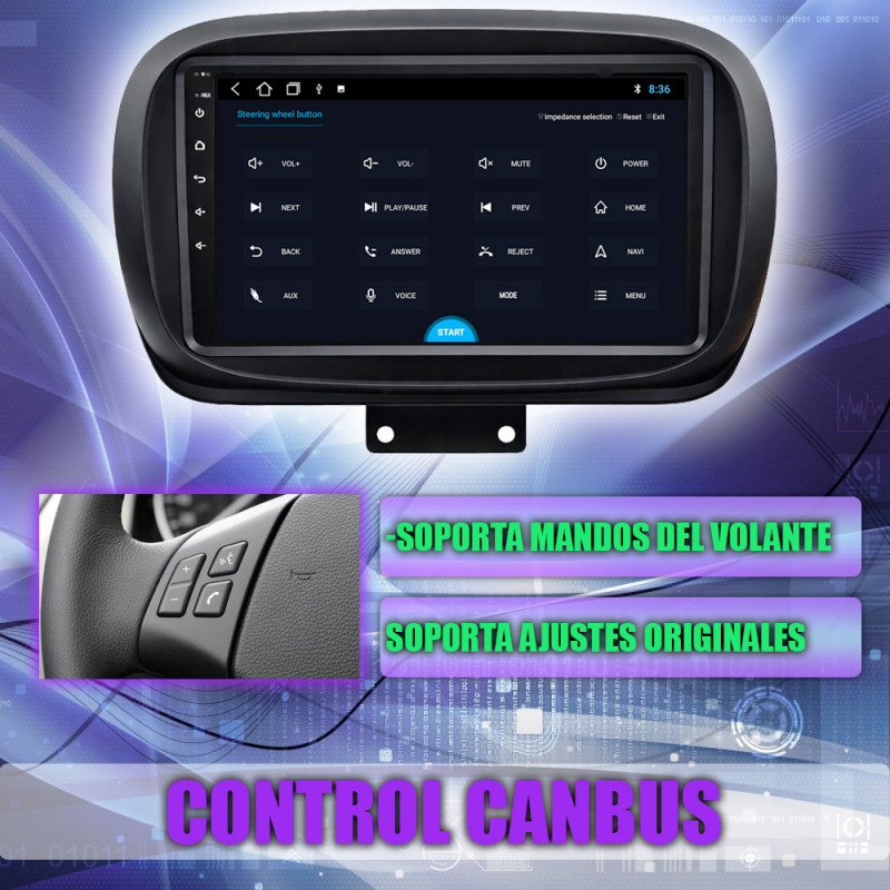 Soporta comunicación CANBUS, permitiendo controlar desde la pantalla los mandos del volante, sensores del coche y ajustes específicos del Fiat 500X.