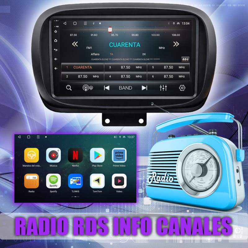 Radio FM con RDS, muestra nombres de emisoras y datos adicionales.