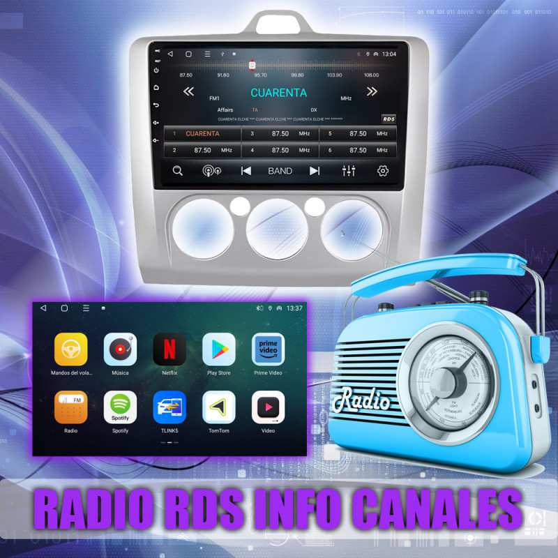 Radio FM con RDS, muestra nombres de emisoras y datos adicionales.