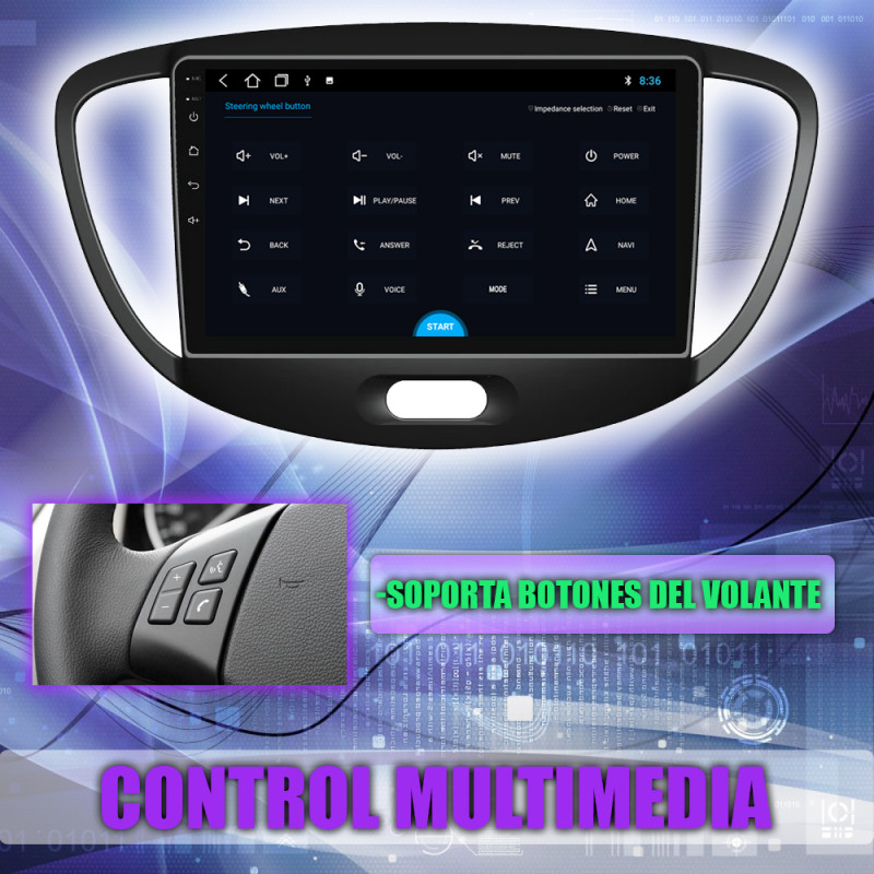 Soporta comunicación mandos del volante, permitiendo controlar desde la pantalla los mandos del volante del Hyundai i10.