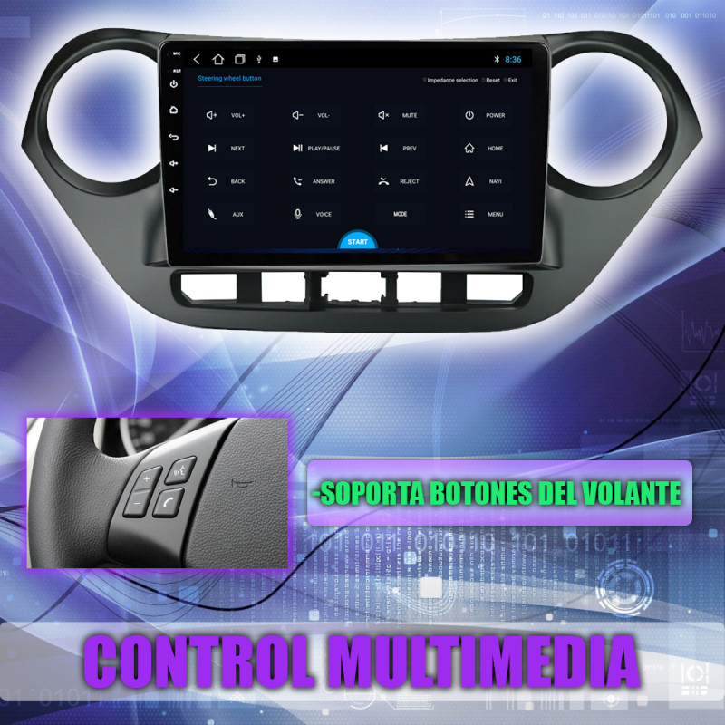 Soporta comunicación mandos del volante, permitiendo controlar desde la pantalla los mandos del volante del Hyundai i10.