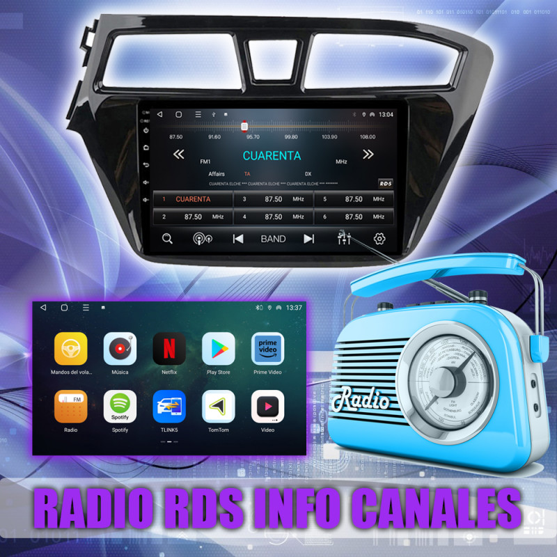 Radio FM con RDS, muestra nombres de emisoras y datos adicionales.