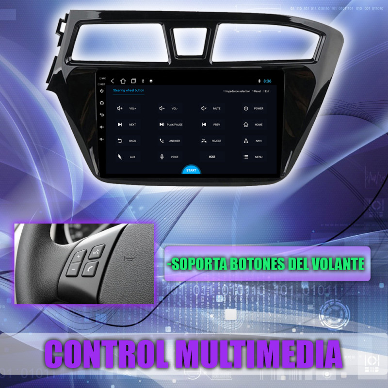 Soporta comunicación mandos del volante, permitiendo controlar desde la pantalla los mandos del volante del Hyundai i20.