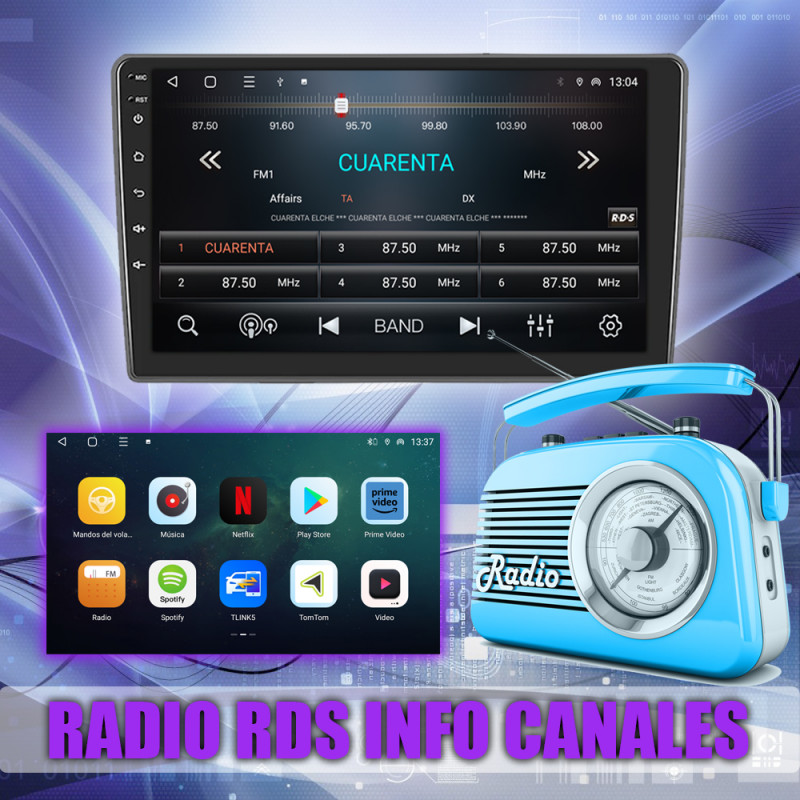 Radio FM con RDS, muestra nombres de emisoras y datos adicionales.
