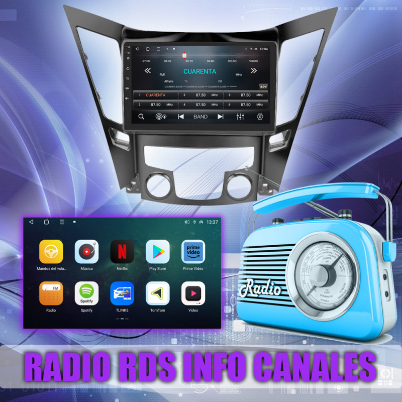 Radio FM con RDS, muestra nombres de emisoras y datos adicionales.