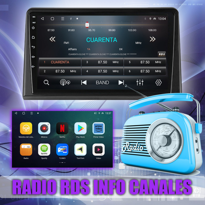 Radio FM con RDS, muestra nombres de emisoras y datos adicionales.
