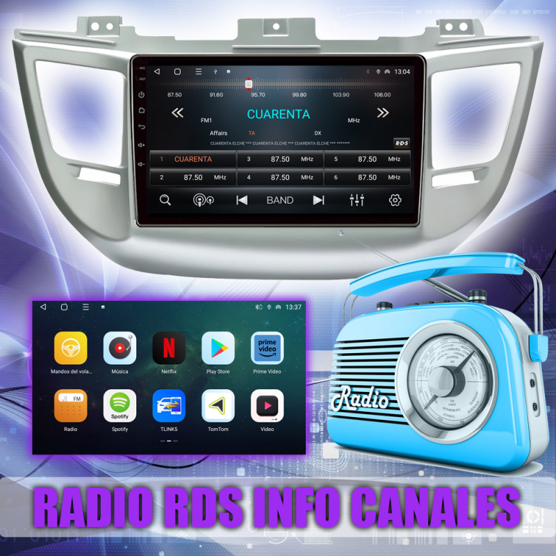 Radio FM con RDS, muestra nombres de emisoras y datos adicionales.