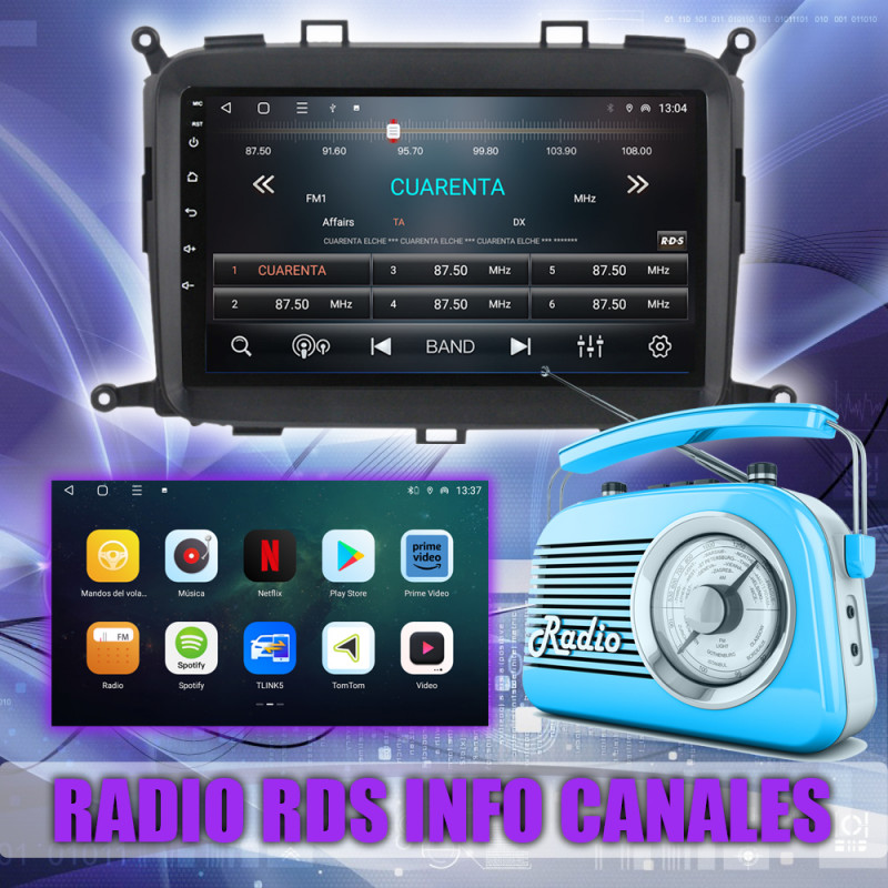 Radio FM con RDS, muestra nombres de emisoras y datos adicionales.