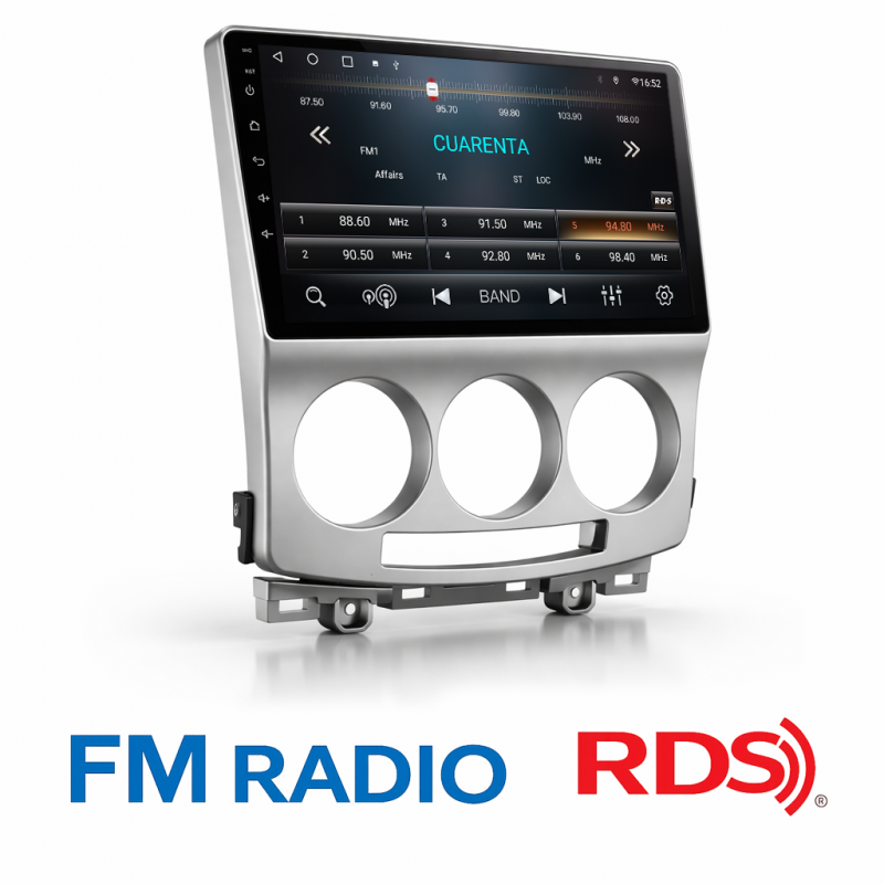 Radio FM con RDS, muestra nombres de emisoras y datos adicionales.