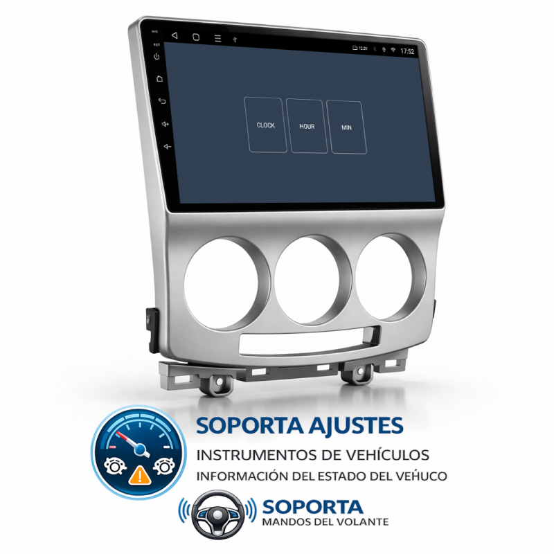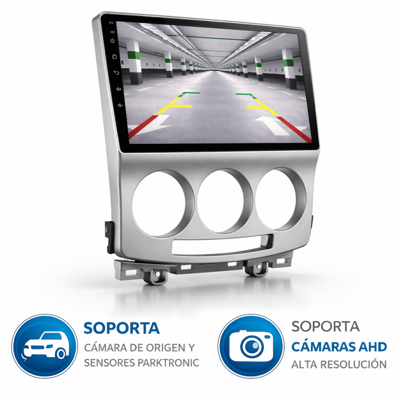 Soporta comunicación CANBUS, permitiendo controlar desde la pantalla los mandos del volante, sensores del coche y ajustes específicos del Mazda 5.