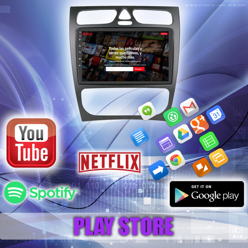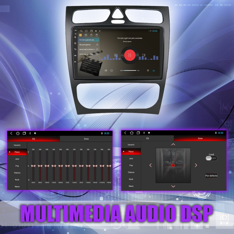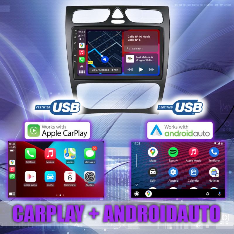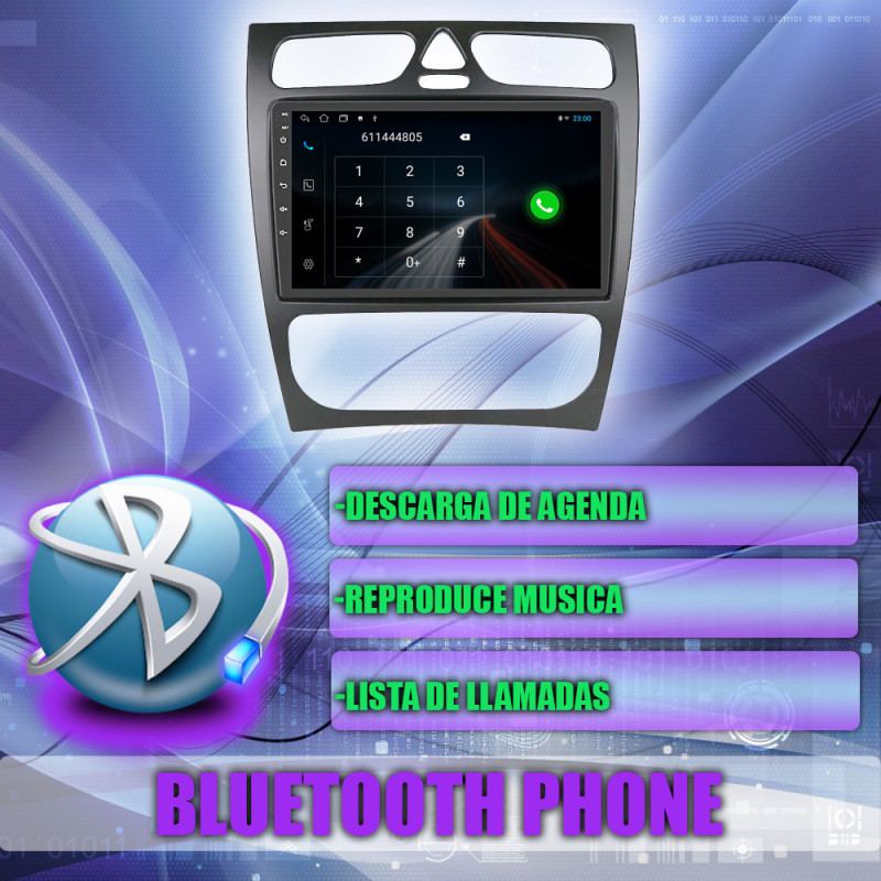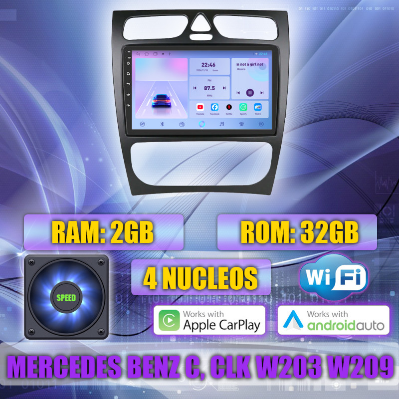 Una pantalla perfecta para Mercedes Benz Clase C W203 CLK W209 1998-2006 dispositivo HD 2K 1280*720 IPS Multitactil de 9 pulgadas. Un diseño especial del interfase TS7, amplificador de sonido con actualizador DSP integrado. Procesador Core 4 núcleos ARM CORTEX-A7 1300MHz TS7 RAM:2GB, memoria interna de 32gb de R0M, también acepta memoria externa hasta 128GB. Disfruta de Carplay con la conexiona por cable de datos USB para dispositivos iOS Apple y AndroidAuto para móviles con sistema operativo Android conexión USB. Bluetooth incluido con la versión 4, reproduce música de cualquier tipo de móvil.