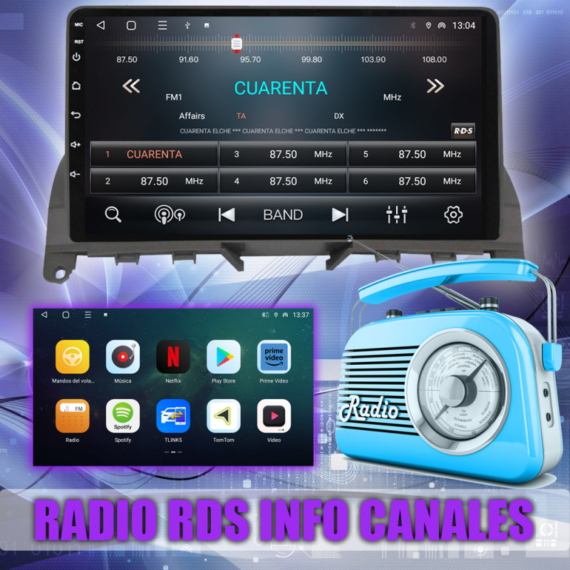 Radio FM con RDS, muestra nombres de emisoras y datos adicionales.