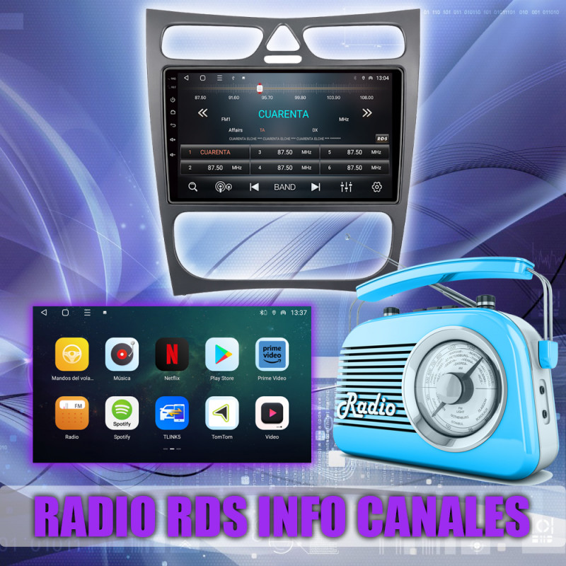 Radio FM con RDS, muestra nombres de emisoras y datos adicionales.