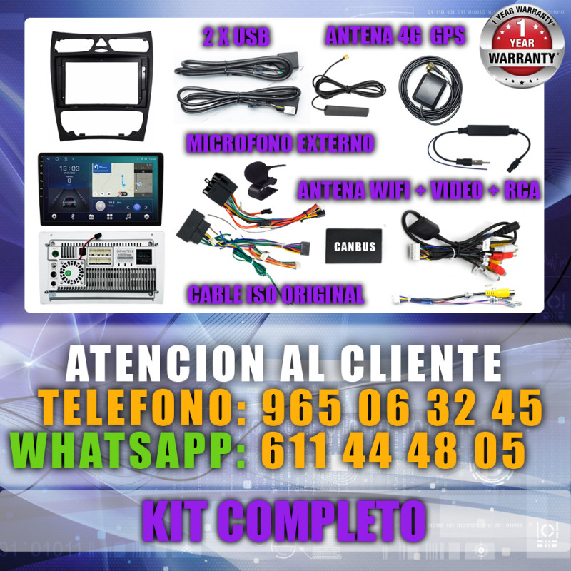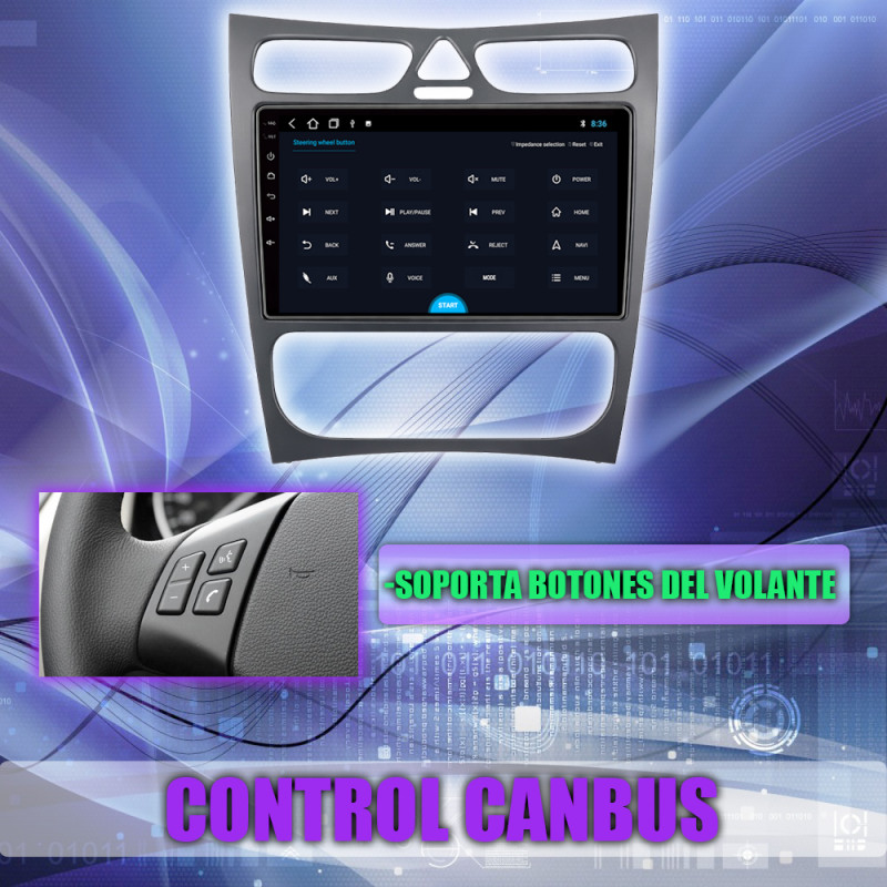Soporta comunicación CANBUS, permitiendo controlar desde la pantalla los mandos del volante, sensores del coche y ajustes específicos del Mercedes Benz Clase CLK W209.