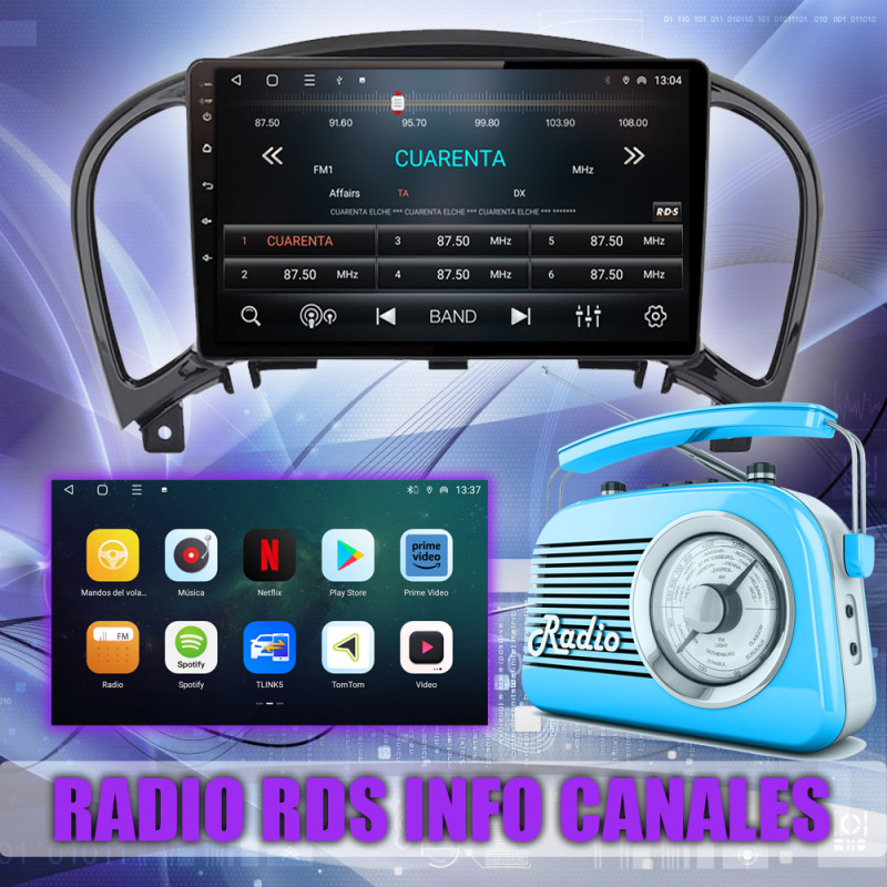 Radio FM con RDS, muestra nombres de emisoras y datos adicionales.