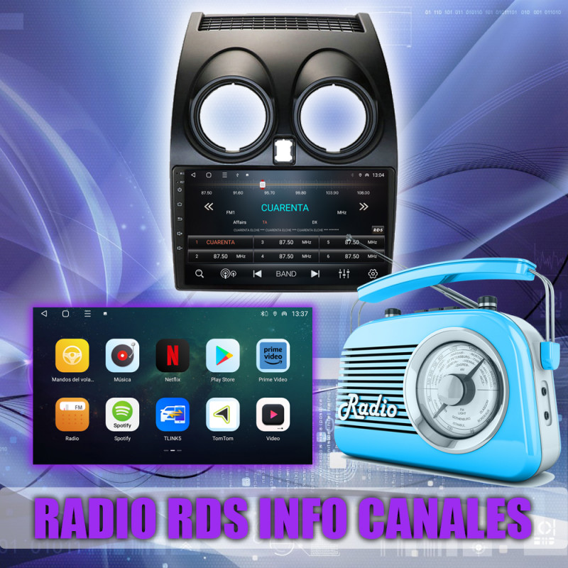 Radio FM con RDS, muestra nombres de emisoras y datos adicionales.
