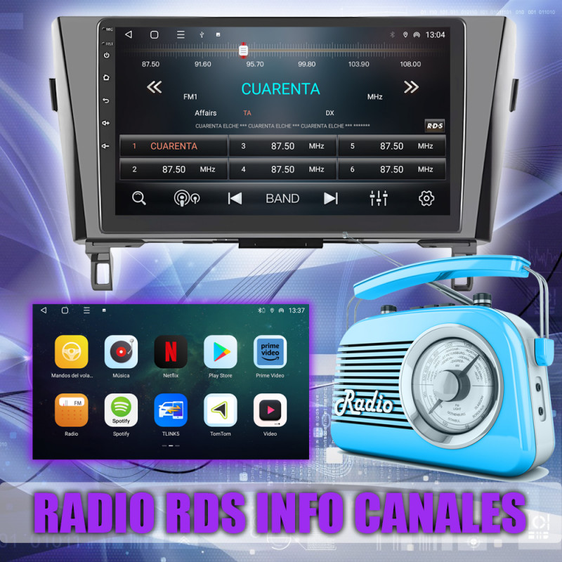Radio FM con RDS, muestra nombres de emisoras y datos adicionales.