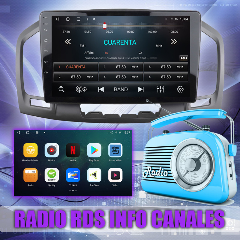 Radio FM con RDS, muestra nombres de emisoras y datos adicionales.