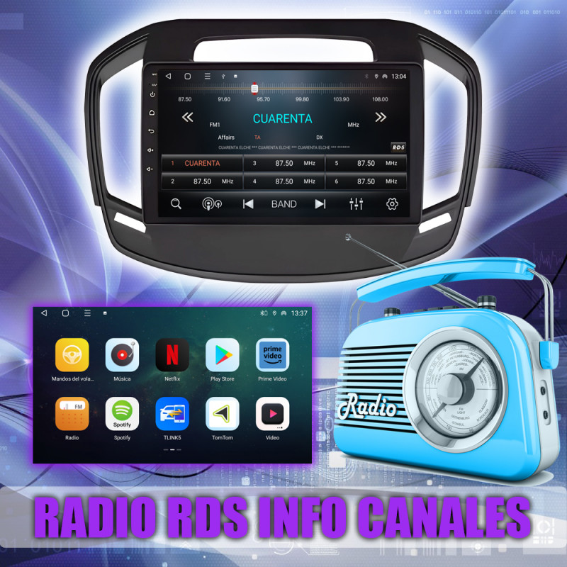 Radio FM con RDS, muestra nombres de emisoras y datos adicionales.
