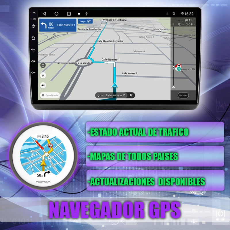 Memoria 2 GB de RAM y 32 GB de almacenamiento interno (ROM) para aplicaciones, mapas y contenido multimedia.