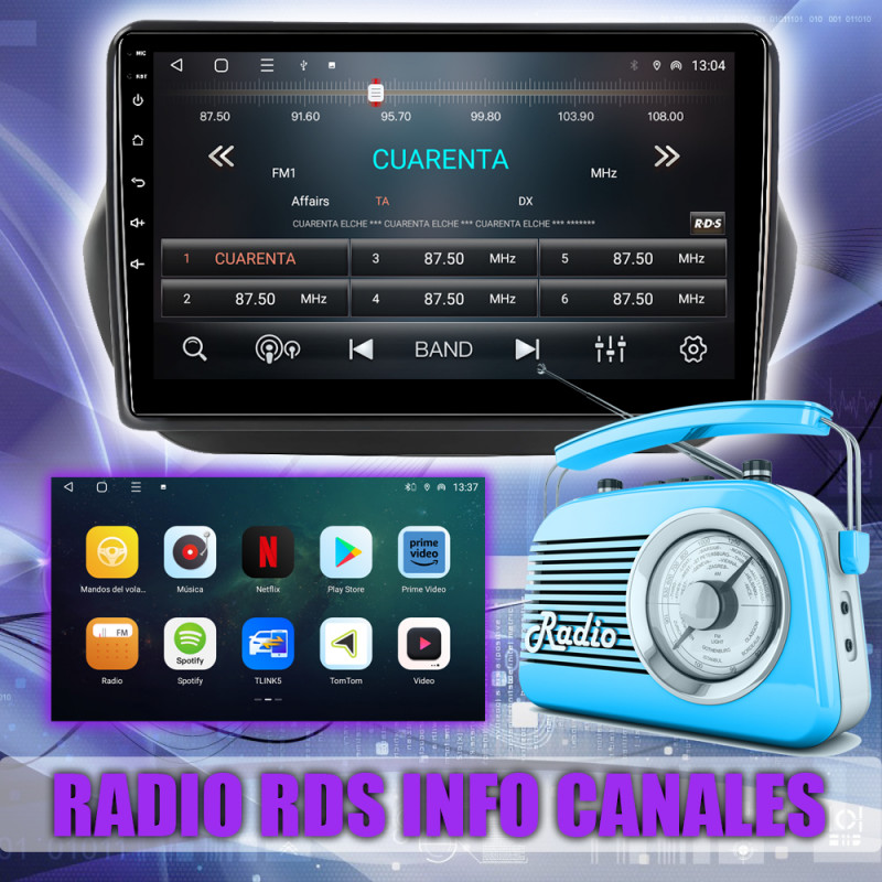 Radio FM con RDS, muestra nombres de emisoras y datos adicionales.