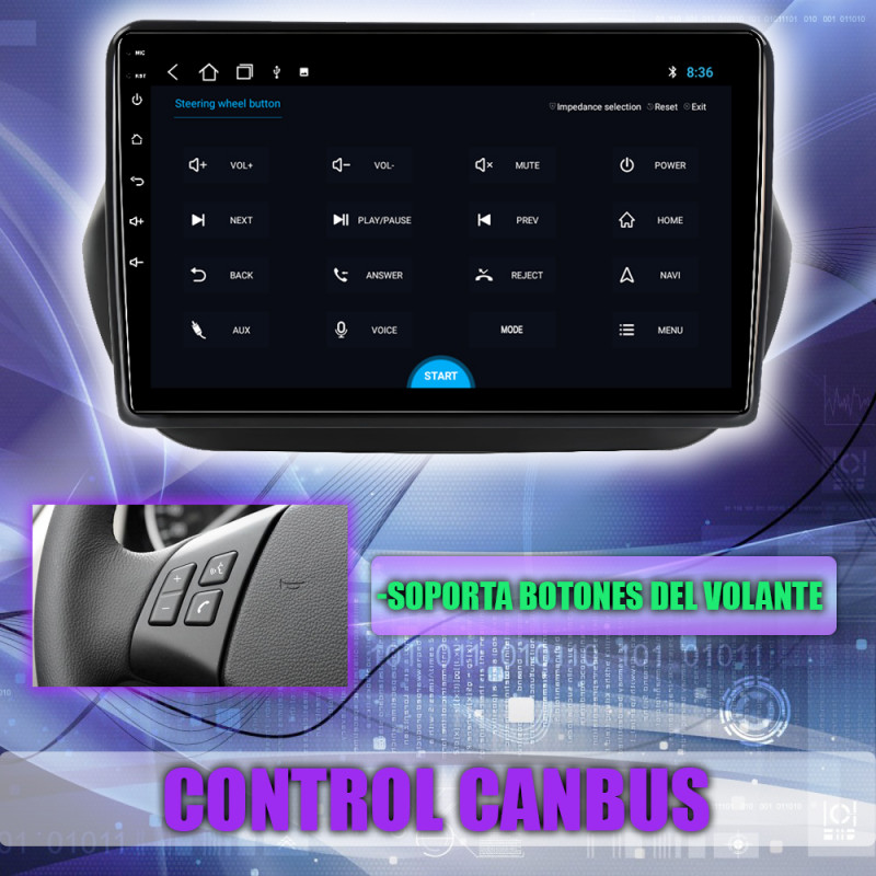 Soporta comunicación CANBUS, permitiendo controlar desde la pantalla los mandos del volante para Peugeot Bipper, Citroen Nemo, Fiat Fiorino Qubo.