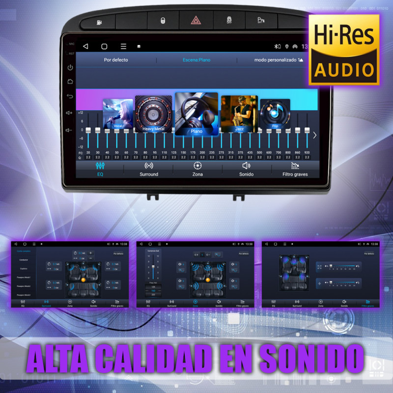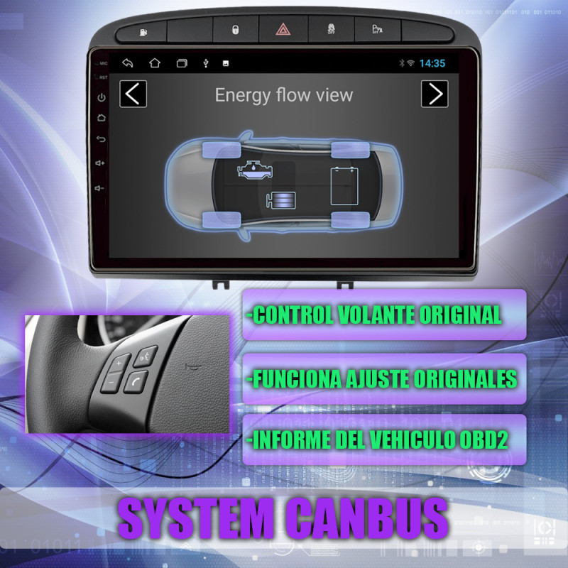 Soporta comunicación CANBUS, permitiendo controlar desde la pantalla los mandos del volante, sensores del coche y ajustes específicos del Peugeot 308, 408.