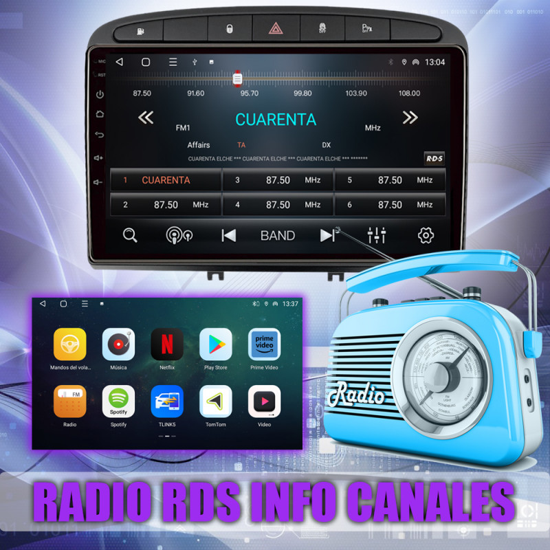 Radio FM con RDS, muestra nombres de emisoras y datos adicionales.