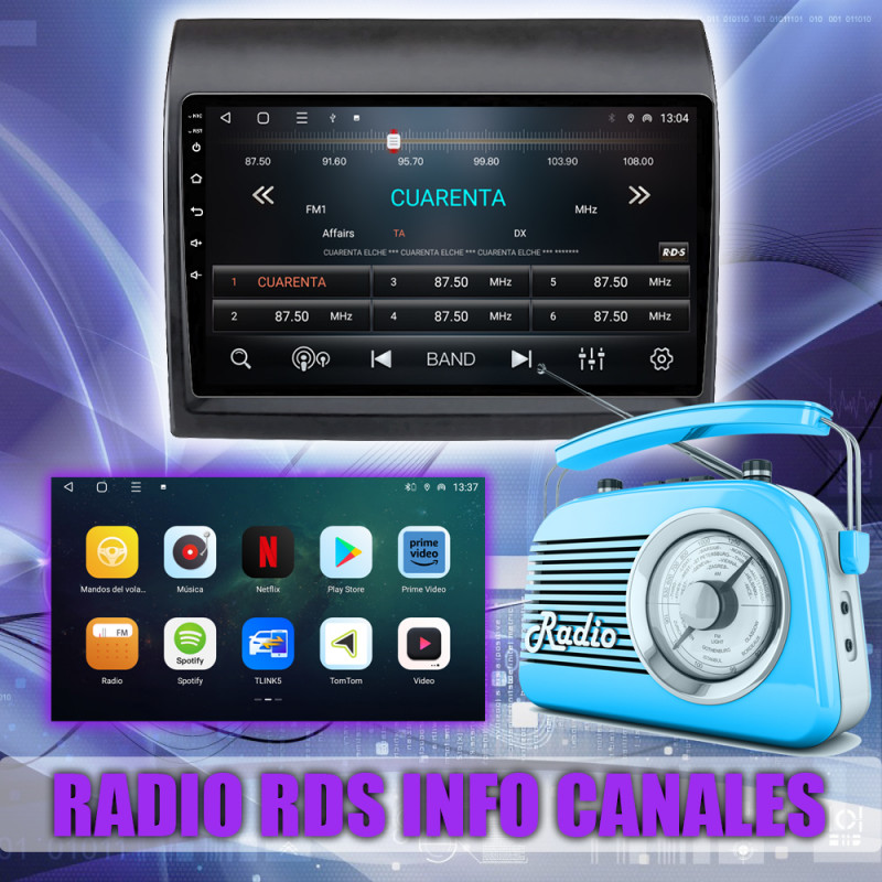 Radio FM con RDS, muestra nombres de emisoras y datos adicionales.