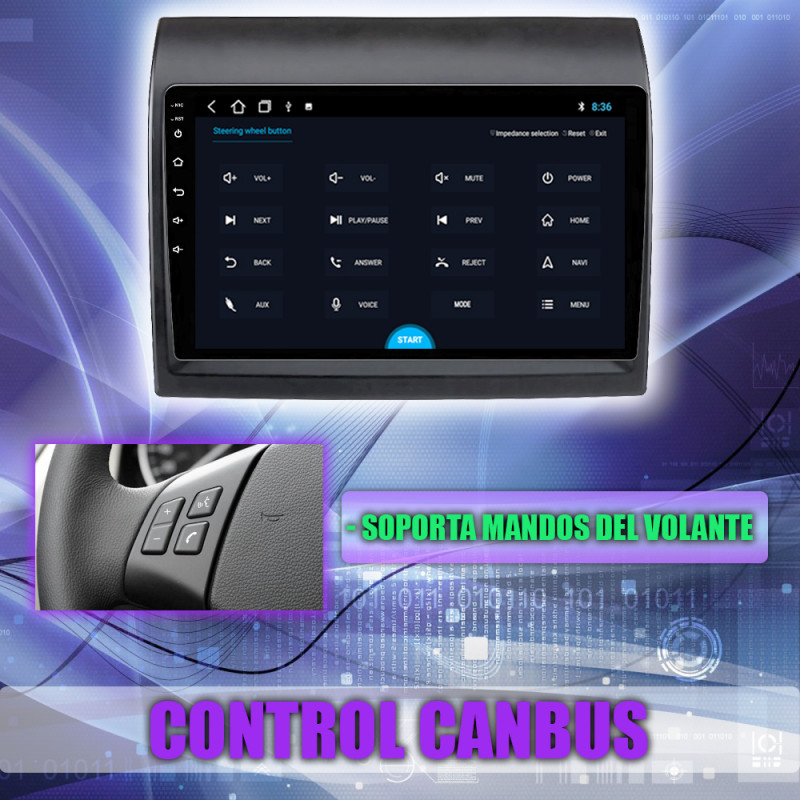 Soporta comunicación CANBUS, permitiendo controlar desde la pantalla los mandos del volante del Peugeot Boxer, Citroen Jumper, Fiat Ducato.