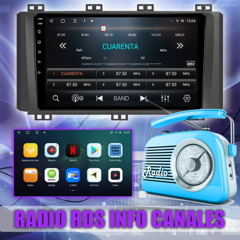 Radio FM con RDS, muestra nombres de emisoras y datos adicionales.