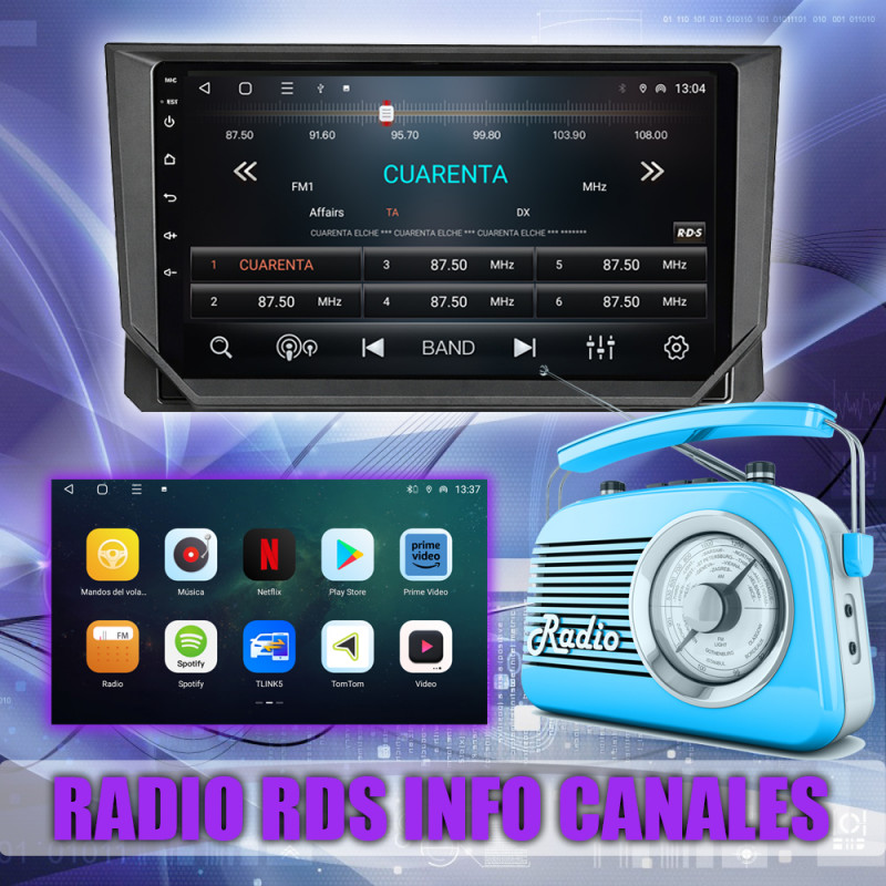 Radio FM con RDS, muestra nombres de emisoras y datos adicionales.