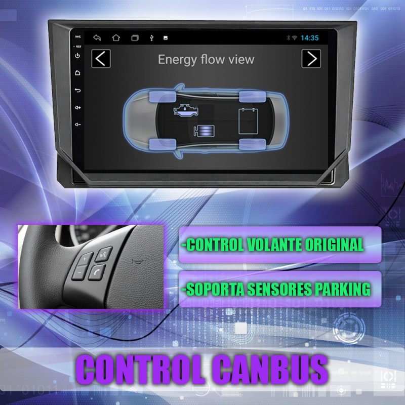 Soporta comunicación CANBUS, permitiendo controlar desde la pantalla los mandos del volante, sensores del coche y ajustes específicos del Seat Ibiza.