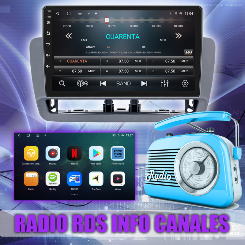 Radio FM con RDS, muestra nombres de emisoras y datos adicionales.