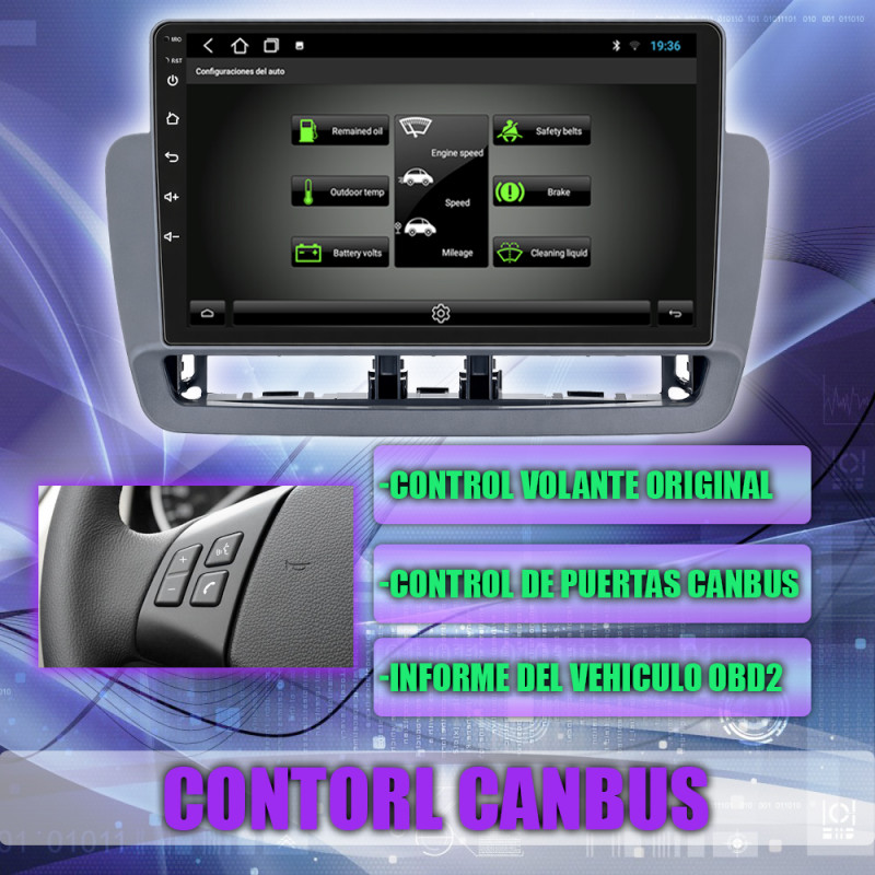 Soporta comunicación CANBUS, permitiendo controlar desde la pantalla los mandos del volante, sensores del coche y ajustes específicos del Seat Ibiza 6j.