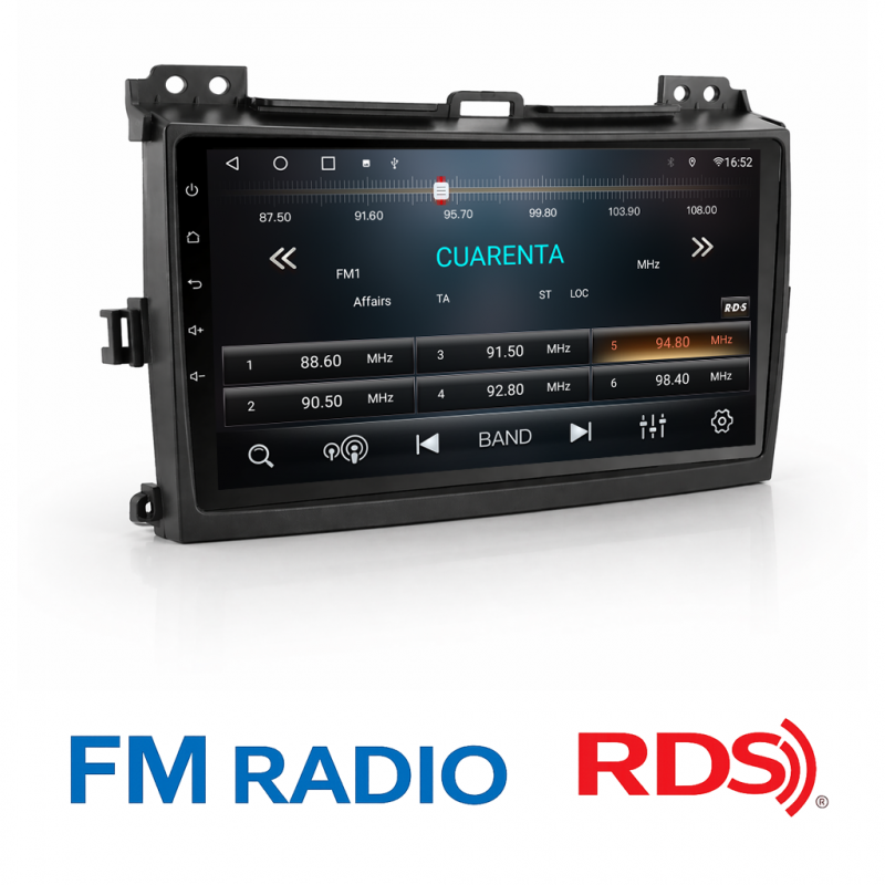 • Radio FM con RDS, muestra nombres de emisoras y datos adicionales.