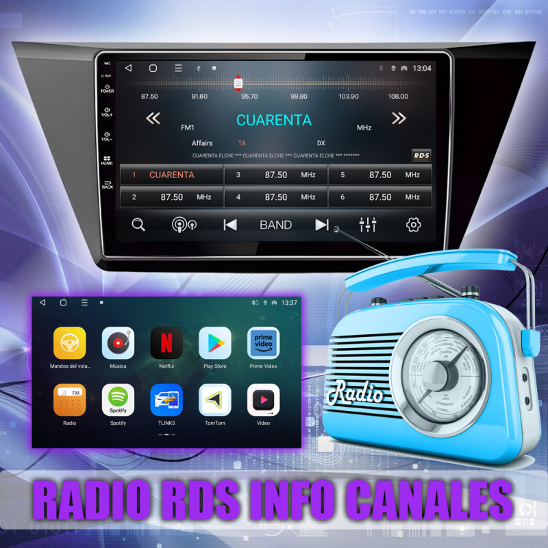 Radio FM con RDS, muestra nombres de emisoras y datos adicionales.